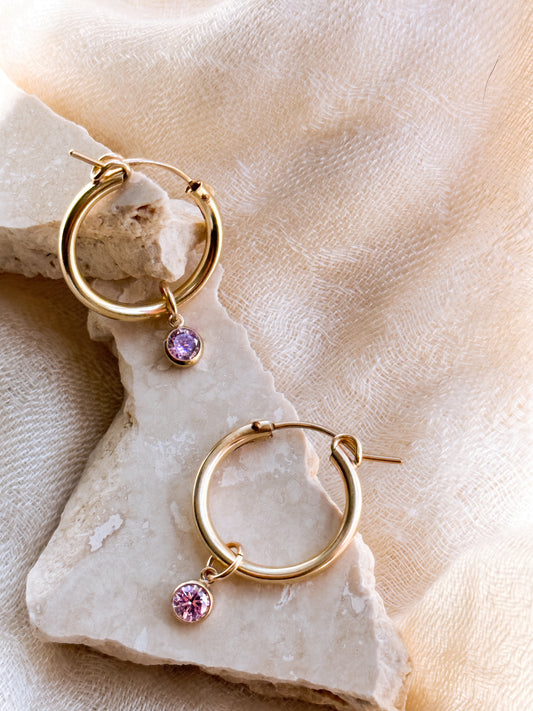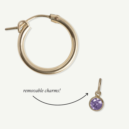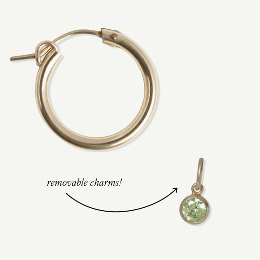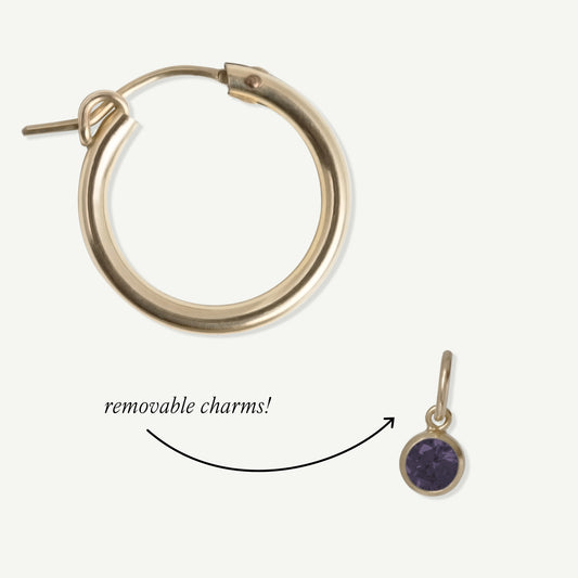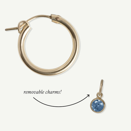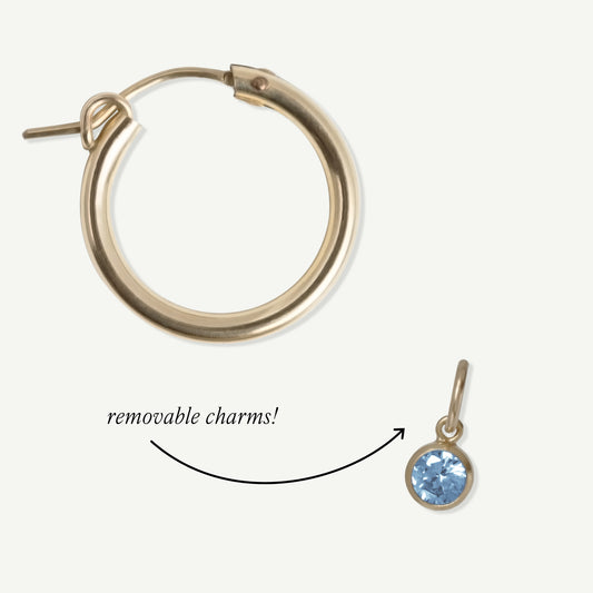 Indulge in the ultimate mix & match moment with these classic golden hoops that have removable charms. Wear them solo, with the charms on, or half and half to switch things up for earrings that are uniquely yours.